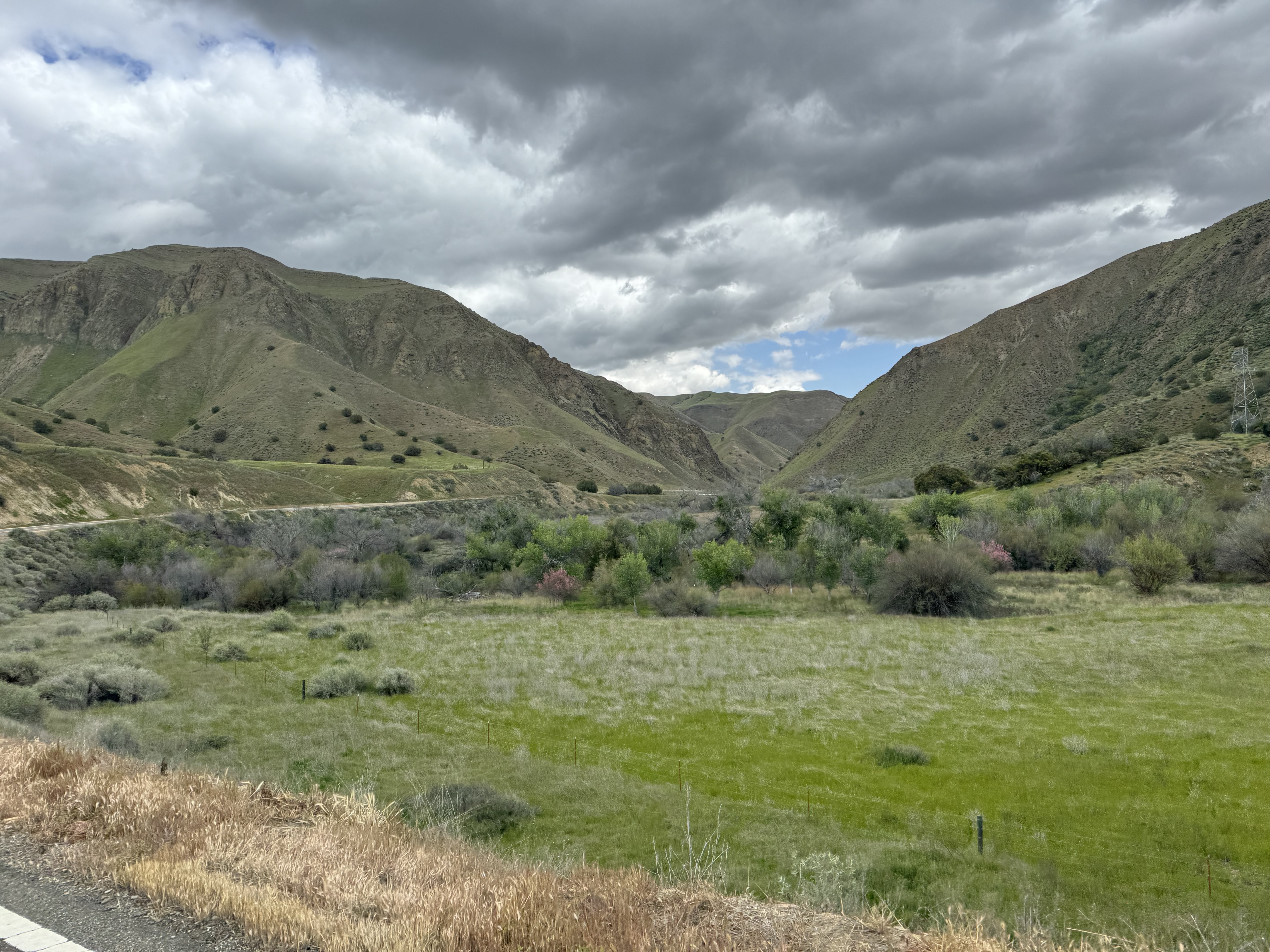 After some boring Highway 101 down to King City, I turned east on Highway 198 to Coalinga, which is quite nice! Mid speed road with sweepers. Only a couple of properly twisty turns. Great view as I rode down and across the CA-25/Peach Tree Road valley. Yellow and purple wildflowers sprinkled on the green grassy hillsides.