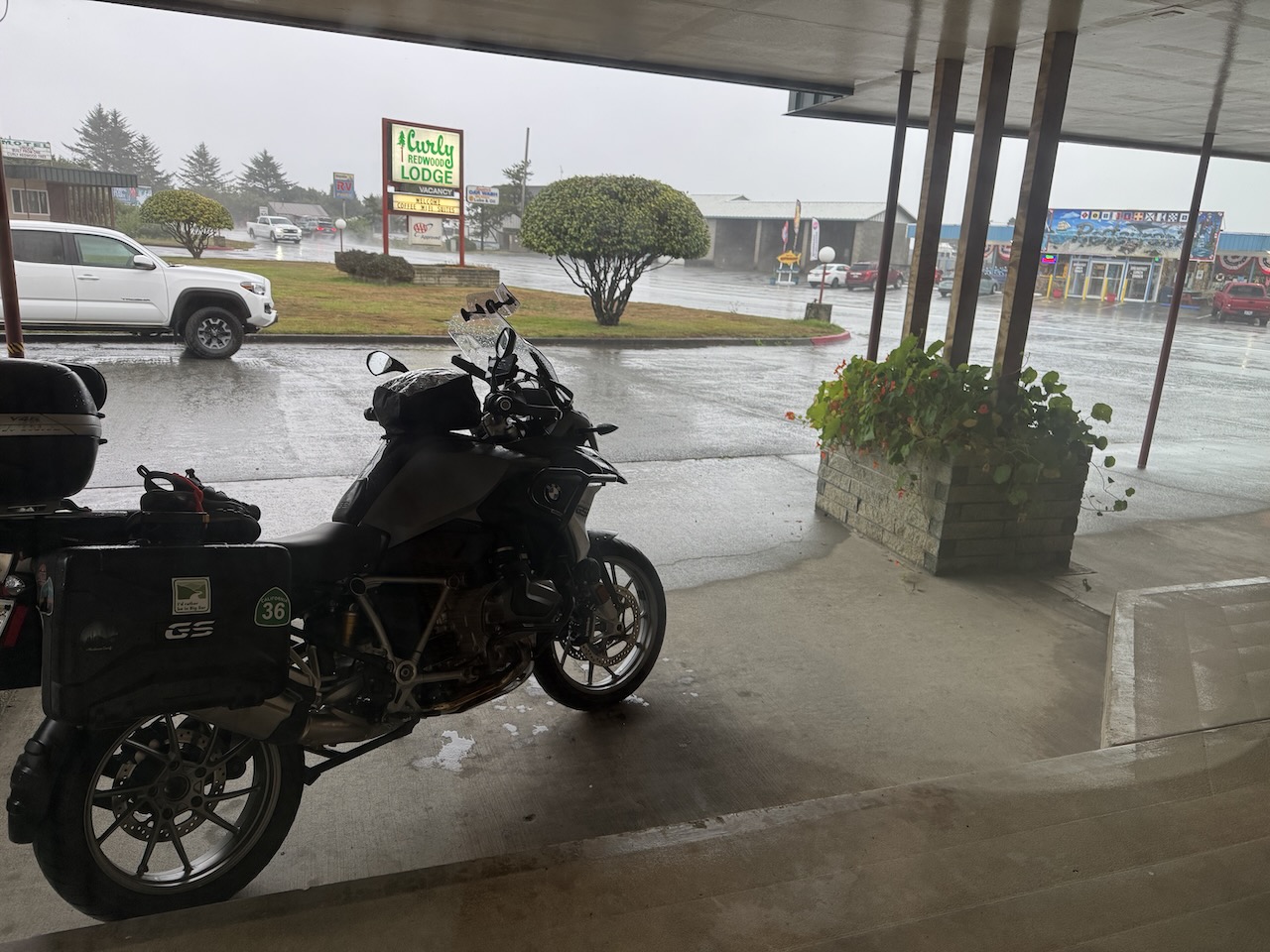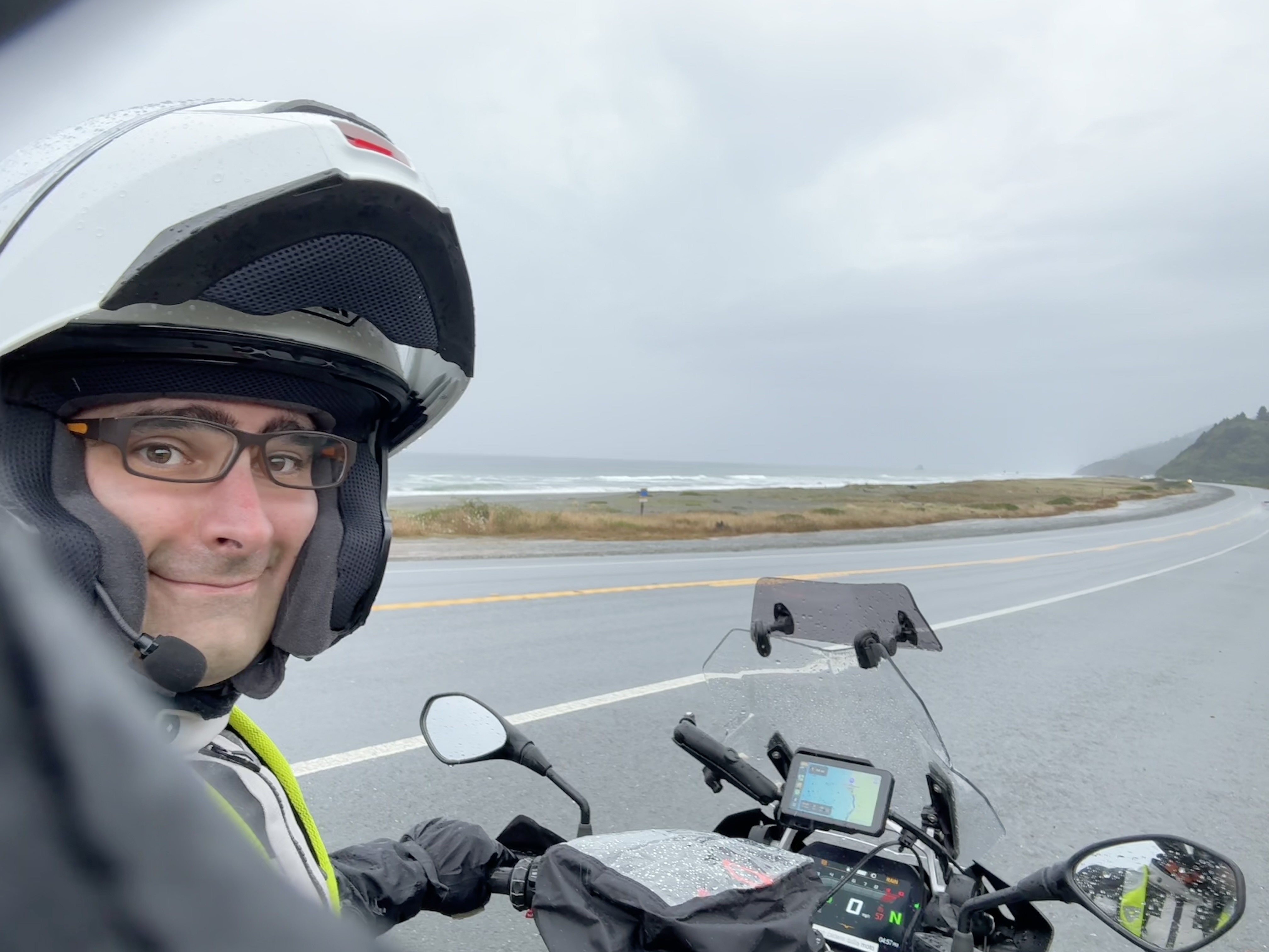 I picked up the rain at Fernbridge. With all my layers already on, I just carried on and turned cruise control down a little. I stopped at Eureka for fuel. After McKinleyville, traffic thinned. Often it felt like I had the road to myself.